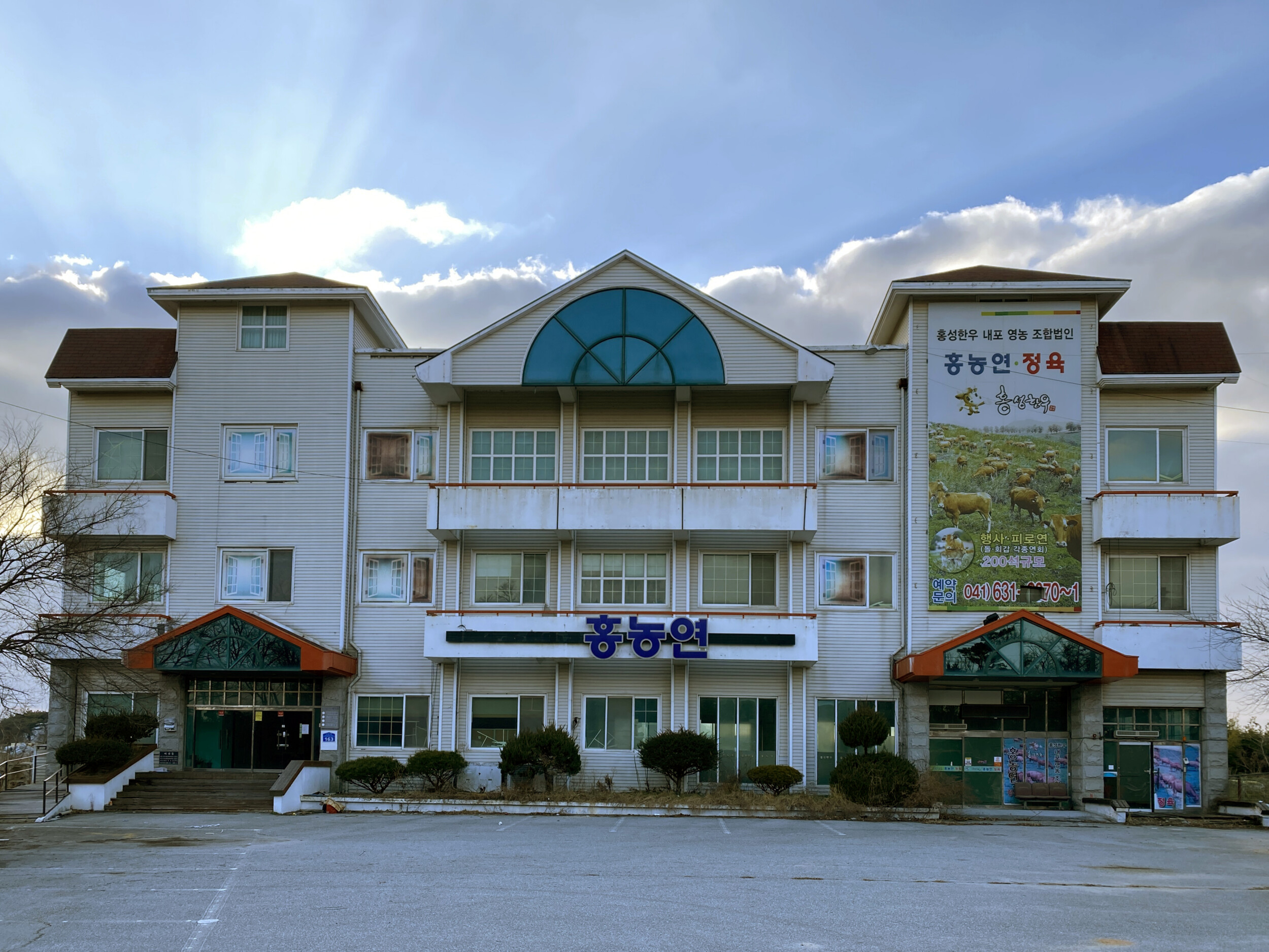 이 프로젝트는 홍성의 신도심과 구도심 사이에 놓인 홍농연회관을 ‘농업인 공유플랫폼’으로 전환하는 작업이다. 대지의 남쪽에는 군청과 터미널, 역을 중심으로 형성된 기존 시가지가 있고, 북쪽에는 도청과 행정시설, 산업단지를 중심으로 확장 중인 신도시가 자리한다. 이 건물은 그 사이에서 오랫동안 국도변의 개별적 오브제로 존재해왔다. 주변과의 관계를 만들기보다 독립된 건물로 서 있었고, 외부공간과의 연결도 충분하지 않았다. 이 프로젝트의 출발점은 바로 이 단절된 상태를 전환하는 데 있다. 건물을 하나의 완결된 대상이 아니라, 두 도시 조직 사이를 매개하는 생활의 기반시설로 다시 작동시키는 것이다.