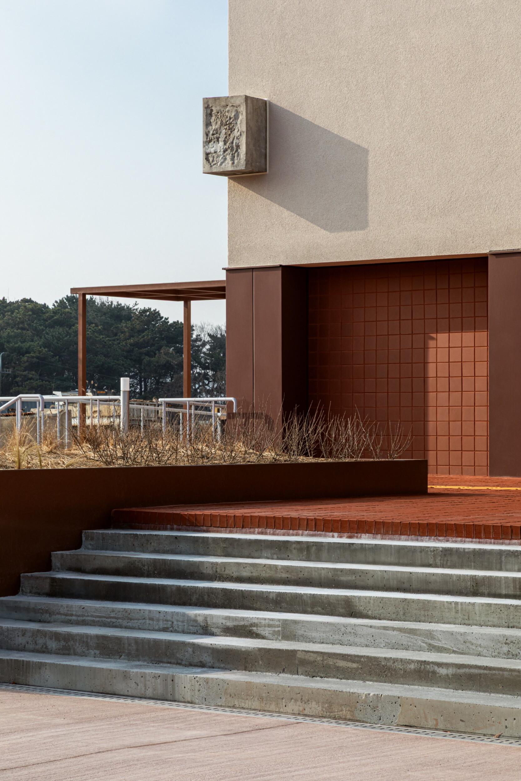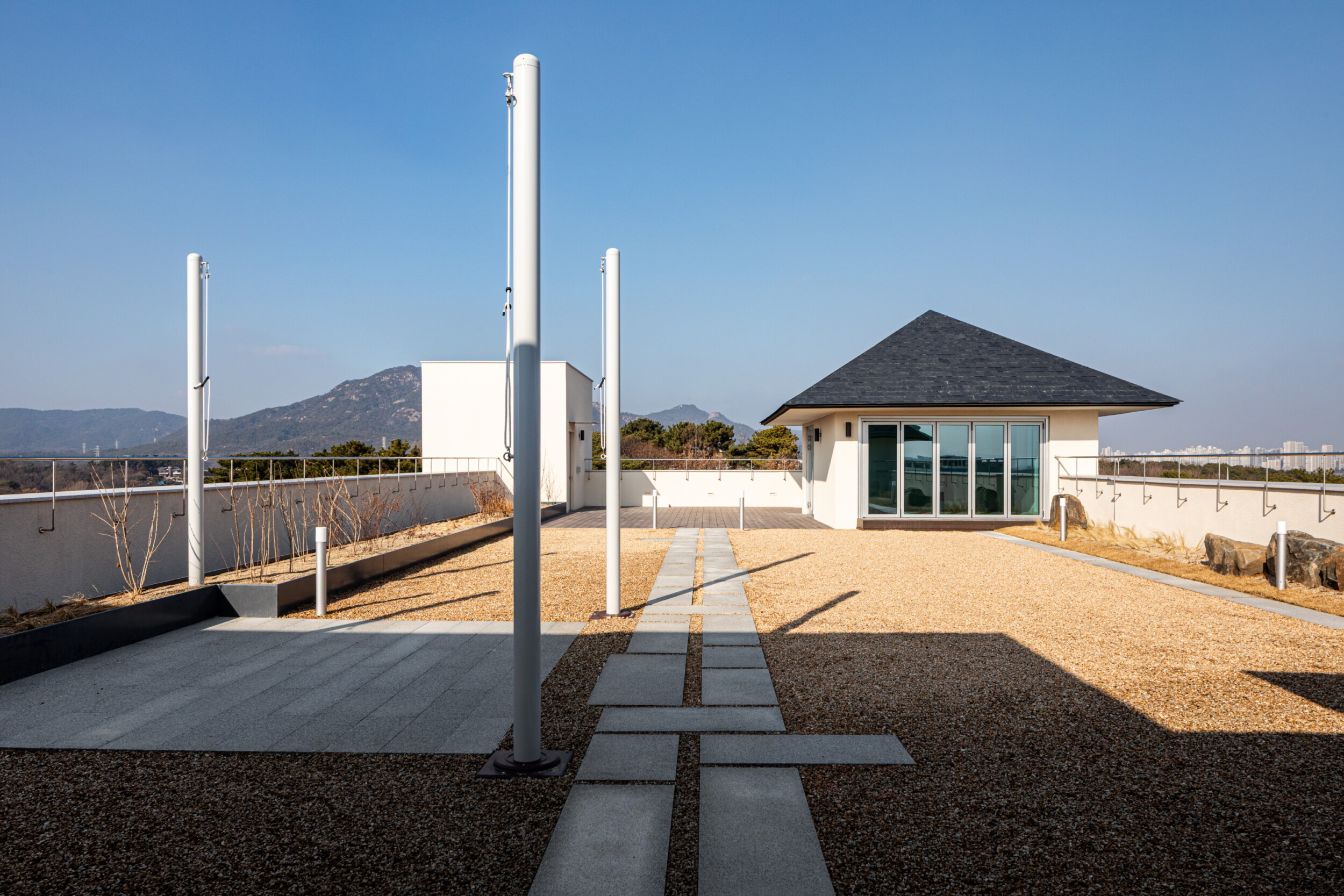옥상은 이 프로젝트가 기존 건물의 정체성을 가장 간결하게 재해석하는 부분이다. 기존의 박공지붕 형상을 활용한 두 개의 정자는 각각 좌식과 입식의 휴게공간이 되고, 그 사이에는 경량의 마감과 디딤석, 잔잔한 식재로 이루어진 정적 정원이 놓인다. 동시에 태양광 패널, 물탱크, 실외기 같은 설비 공간은 사용자 공간과 분리되어 배치된다. 옥상을 단순한 휴게 데크로 꾸미지 않고, 하중 증가를 최소화해야 하는 리모델링의 조건을 수용하면서도, 휴게와 설비, 조망과 운영이 충돌하지 않는 질서를 만든다. 이는 조형적 제스처보다 사용의 분리와 공존을 우선한 태도이며, 기존 건물의 지붕 풍경을 새로운 커뮤니티 장치로 바꿔놓는 전략이기도 하다.
