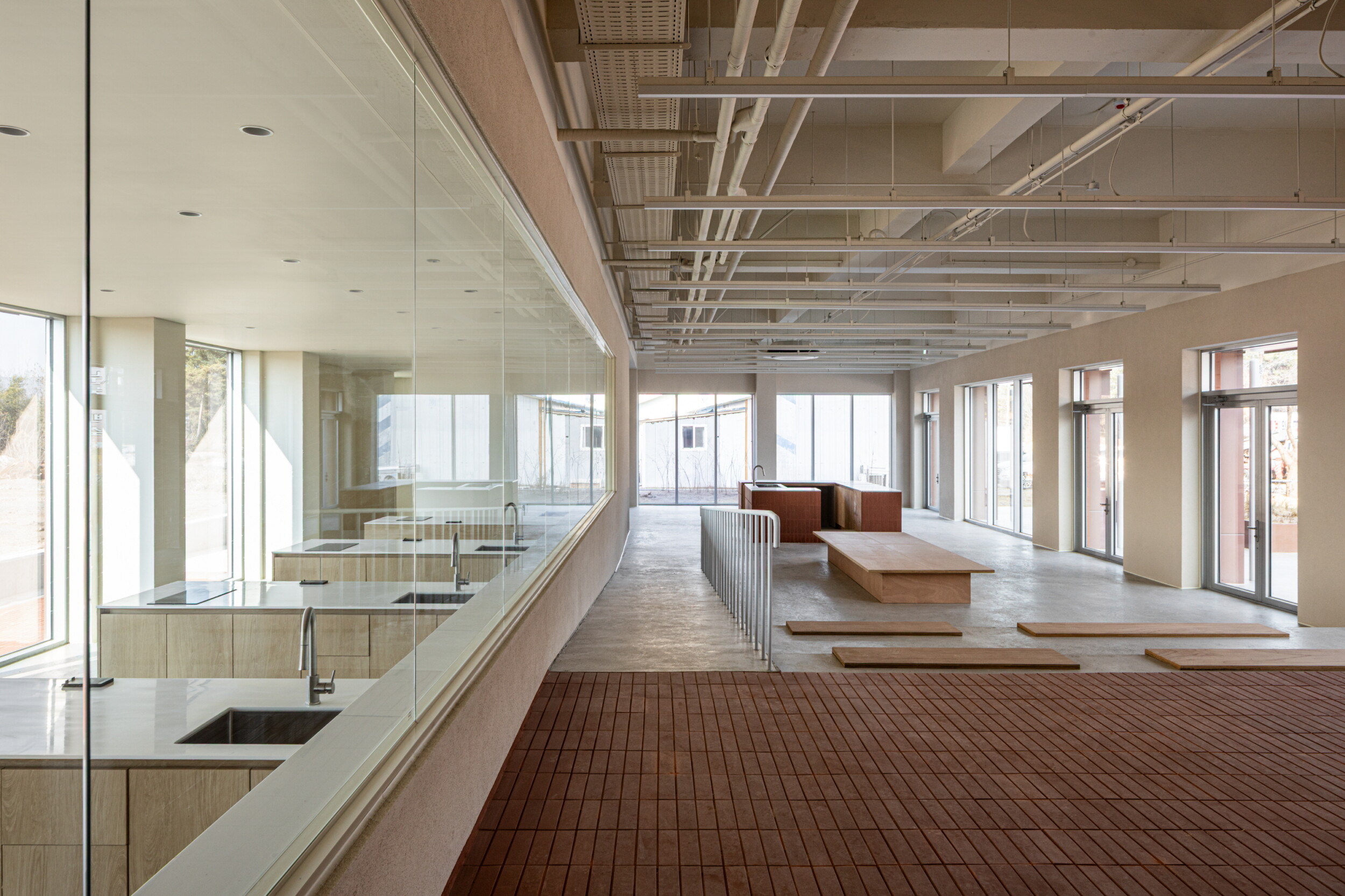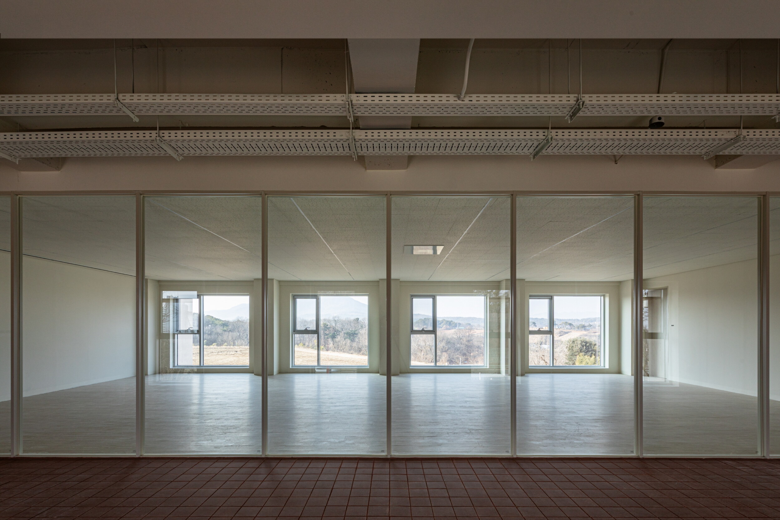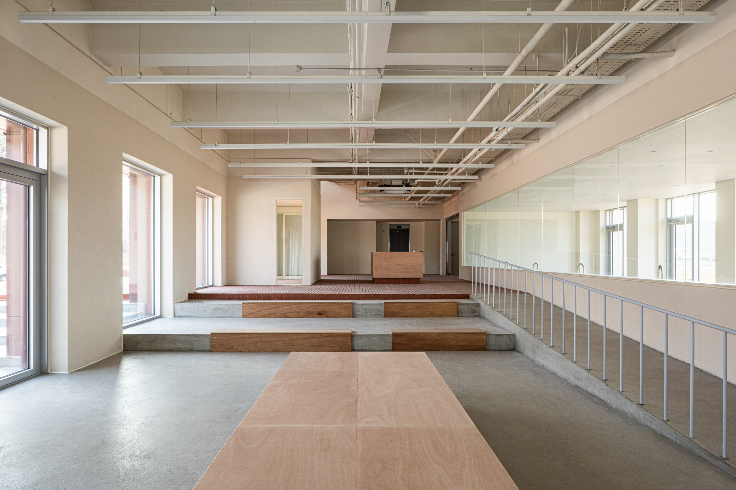 저층부의 1층은 이 프로젝트의 가장 개방적인 면을 담당한다. 농가맛집, 카페, 조리체험실, 로비가 장터마당과 맞물리며 배치되고, 폴딩도어와 슬라이딩 창, 테라스, 캐노피와 천막용 폴대 시스템이 내외부의 경계를 느슨하게 만든다. 1층에서 중요한 것은 프로그램의 개별성보다 서로 다른 사용 주체의 동선이 분리되면서도 순환하도록 짜여 있다는 점이다. 장터를 찾는 사람, 카페를 이용하는 사람, 체험공간을 사용하는 사람의 흐름은 충돌하지 않으면서도 서로의 활동을 가시권 안에 둔다. 그 결과 1층은 하나의 실내 프로그램이 아니라, 계절과 행사에 따라 밀도와 쓰임이 바뀌는 확장된 공용장으로 읽힌다. 농촌의 공유공간이란 결국 건물 안쪽의 방을 늘리는 일이 아니라, 생활과 교류가 번지는 가장자리를 만드는 일임을 보여준다.